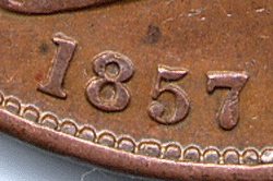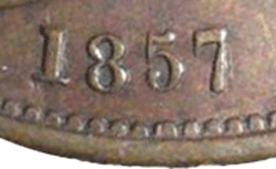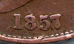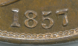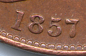 1857 Copper Penny (Type 1 & 4) - 10 bead spacing - Date: Style C The base of the 1 is lower than the other 3 numerals '857' The 7 has no down tooth at end of top bar. Note - The larger size border tooth is now central below 5
