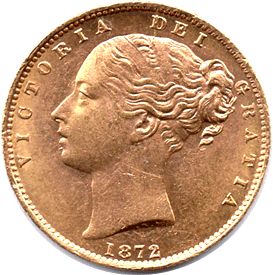 1872 Sovereign - shield-back Melbourne Mint (Small 'M' below wreath tie - 6 o'clock) Obv. Die crack (12 o'clock) From rim thru D of DEI onto Victoria hair to just below lower hair-ribbon. Grade: A really nice EF coin the reverse possibly even better.