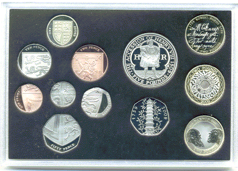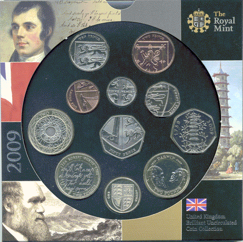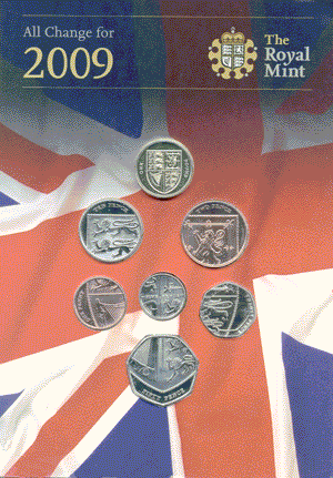 The complete set of seven UK coins - from the £1 to the 1p - all featuring their new designs unveiled in 2008 (The 2008 set is SOLD out from the Royal Mint). Is now available dated 2009. The coins are issued in a colourful display folder.