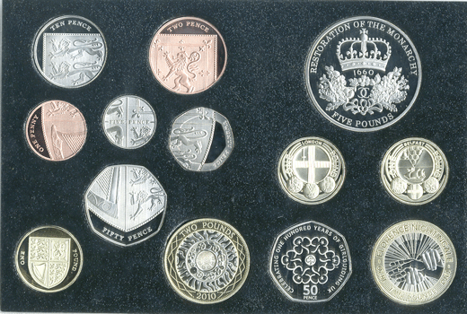 The 2010 Royal Mint proof set There are Three new commemorative coins as well a new series of £1 coin reverse designs of which TWO are included in the set. Commemorative Coins: £5.00 - The Restoration of the Monarchy (350th Anniversary - [1660]) £2.00 - Florence Nightingale - 1820 - 1910 (150 years of nursing care - [1860]) 50 pence - The Girl Guides - 1910 - 2010 (100 years)