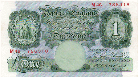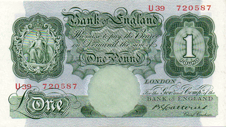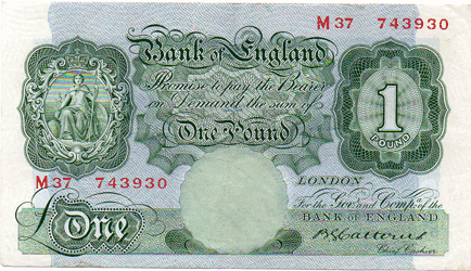 1930 Catterns - 1 Pound - B225. Mid series U~~ (U39) Both sides appear to be Choice & crisp AUNC * AUNC for banknotes that to me look as if they there is a faint flick, mark or even a slight bend (NOT a hard crease). Virtually perfect ! * To most collectors there would appear to be no difference from this note and the above note - but I have just spotted a minor flick or something that takes this banknote down from my UNC to my AUNC ! ~~~~~~~~~~~~~~~~~~~~~~