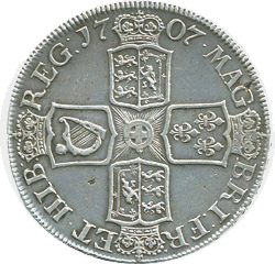 1707 Crown - 2nd bust - Edge: SEPTIMO - Rev. plain in angles. Obv. The 'TI' of GRATIA is weakly struck Rev. Tiny flaw in metal in lower left quarter (NOT a dig !). Grade: EF Pale grey.Te coin is lightly toned with no edge nick or marks - Nice coin !