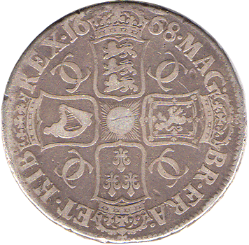 1668 Crown - 2nd bust Edge: VICESIMO Obv. Reasonable face features for Charles II but hair weak or worn. Rev. All four shields and internal motives clear. Date: Unusual with the 8 being double struck - a bit showing to the bottom right side with even a small gap between the two strikes. Grade: Fine - a pleasant coin