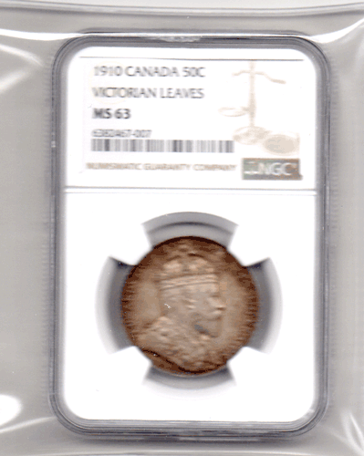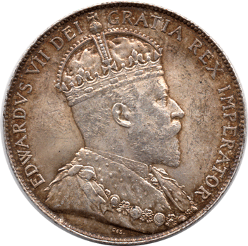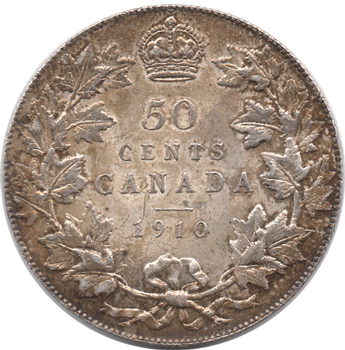 1910 Canada - 50 Cents. Choice unused with lovely toning. The Canadian 50 Cents series is one of the most popular, especially of the earlier issues, Victoria up George VI. The Victorian & Edwardian 50 Cents coins are extremely hard to in anything other than Fair to Fine. This 1910 50 Cents is certainly the finest example I have ever seen or had. It is also the scarcer of the two issue for this year as on the reverse it has the larger Victorian style leaves.