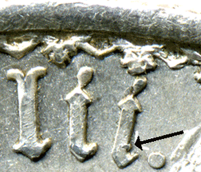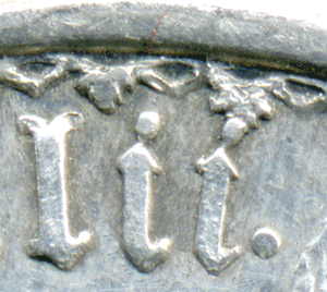 FL 1852 C - shows where an extra digit had been added to the original 1851 die. A 2nd i has been added. Note that the last i tilts forward slightly and is out of alignment with the 1st i. The top of the last i is now just passed the centre of the trefoil - whereas on the normal 1852 die the i it touches the centre of the trefoil. The 'full stop' after the 2nd i is in line with the foot of the curled up tail of the i. Whereas on the normal 1852 die the 'full stop' is above - I have shown this with an arrow - where the 'full stop' would have been on the original 1851 die (MDCCCLI.) - a very small bit, of the full stop, is just sticking out to the right of the 2nd leg - just above where it curls up. FL 1852 D - shows a 1852 normal die but the 2nd i is in fact double struck over the i. The top of 2nd i, is as per FL 1852 A which touches the centre of the trefoil. On this example there is a small piece of the doubled front of the leg of the 2nd i resulting in a double tail .Compare the position of the 'full stop' of this variety with that of FL 1852 A and one will see that the 'full stop' is in a very similar position - i.e the tail or 'foot' of the i is kicking a ball ! FL 1852 E - Rev. n over inverted n in florin - 3 examples of this variety have been seen and listed by Mal Lewendon in the latest English Silver Coinage by Spink.