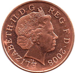 2008 decimal penny with a couple of "air bubbles" in the metal. Obv. Above and between the A B of ELIZABETH and larger bubble above and between B E of ELIZABETH. Listed as OP 2008 D (2nd issue 'Shield' type reverse) - AU95.