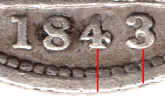 1843 Date varieties All of the 1843 groats have the 18 of the date in a fixed position. The position of the 43 can vary slightly. Date: The top of the 4 is pointed and has a T bar tail.
