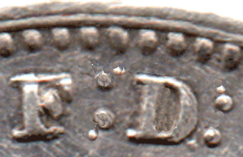Obv. - There is an extra small colon dot above and slightly to the right of the higher colon dot after F: There also appears to be also a small extra colon dot just below and to the left of the lower colon dot. The D: has a small extra colon dot just above and slightly to the left of the higher colon dot. The D: also has a small extra colon dot just below and to the left of the lower colon dot.8