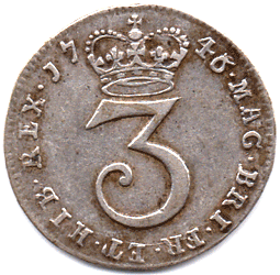 1746 Maundy 3d - The above pictures are to show my conclusions on what has occurred with this date. One reference book concludes that the 6 could be over a 5. I discount this theory as there was no 1745 Maundy 3d coins made so where would the 5 come from ? My scans show how the 3 could be the under date. 1743 was the last date prior to 1746 that any Maundy coins were made. So using up 1743 dies would be logical. The top 'tail' of the 6 was broken or weakly struck. Either it is the back of the 3 that is the new 'tail of the 6 or a punch was used to add a 'bit' from the circular part of the "O" to the back of the 3 !! One would think that there should be a 1746 3d with the 'upright' tail to the 6 but so far it appears that ALL 1746 3ds are as per the above !?