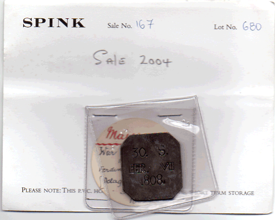 1808 30 Sous issued by Ferdinand VII of Spain for the island of MAJORCA Struck in Parma (Capital) during the quarantine outbreak of Yellow Fever. Struck in silver, 26.6 grams, 33 x 35 mm. Ref: Crl-52.1 or CAL-519 Ex Spink auction 2004, Sale No. 167, Lot No. 680. Still on original card.