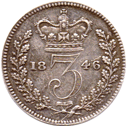 ST 1846 C - Obv. 1 (F: & D: - Type A). Rev. A2 The left tie ribbon is very weakly struck (virtually non-existent) ! It should show completely, under, the end of end stalk of the wreath. The right stalk end of the wreath (on the left side) also is incompletely struck. * See the link for what Rev. A1 - with missing ribbon ends & wreath stalks look like. * I have had six examples of this extremely rare date and ALL examples have very weak left ribbon tie and incomplete left stalk end to the wreath (on the left side). The (above) EF+ example has more of the left tie ribbon showing than the EF example. On both example the stalk end of the right side wreath ends short of the normal. I would be interested to hear from any one else that has 1846 3d (Maundy or Currency) if they have an example of this coin with the left ribbon tie ribbon & stalk end complete ! Date: All numerals - Large Grade: EF Toned SOLD This is an extremely rare date and especially in this grade.