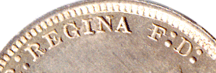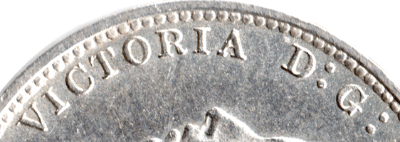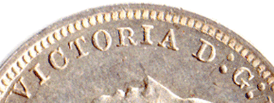 Obverse 3: Leg of R of RIA to gap; I of RIA to tooth; A of RIA to gap. Many small border teeth. Small gap between A of VICTORIA & D: of D: G: Colon dots after G: close. Obverse 4: Leg of R of RIA to tooth; I of RIA to gap; A of RIA to tooth. larger, less border teeth Larger gap between A of VICTORIA & D: of D: G: Colon dots after G : wider