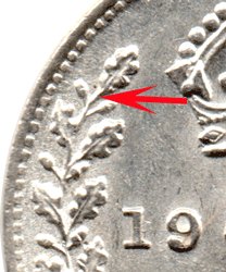 ST 1920 A - Obv. 3 - The (upright leg ) D of F. D. points to a tooth in the border. The (up right leg) E of GEORGIVS points to a gap between teeth in the border. The tail of the R is pointed. * 1920 is the year that the Royal Mint reduced the amount of silver in the coins, due to the high price of silver on the London Commodity Exchange on 11 February 1920. Coins were reduced from 0.925 silver to 0.500 silver (1/2 silver & 1/2 copper). However, before the reduction in the silver content was made in the silver 3ds several million silver 3ds had already been struck in 0.925 silver. The only way that these coins two different silver content 3ds can be distinguishable is by their "ring". This can be subjective unless one has either a pre 1920 or post 1920 silver 3d to compare the 'ring' tone with. Now finding a way to test this "ring" is more difficult. I tried balancing on the end of my finger and tapping the coin with a plastic toothbrush end. This did not work as my fingertip was as large as the coin ! Next I tried dropping a silver 3d, onto the wooden edge of my desk, from about 6 inches, this appeared to give a better indication of which was 0.925 silver and what was probably 0.500 silver. This is what I found. A silver 3d with 0.925 silver gave a nice 'tingggg' sound whereas A silver 3d with 0.500 silver gave a sort of "dull thud" sound ! The silver 3d with 0.925 also appear to have a high silvery colour whereas The silver 3d with 0.500 can also have a silvery colour but also a duller greyish colour ! Neither of the above descriptions are completely helpful or possibly wholly accurate but I cannot think of a more scientific or easier way to distinguish the between the two silvers. If anyone has a better idea as to distinguish between the two silver types - "accurately" - I would be very pleased to hear of it. Probably 90% of collectors will not care whether the silver 3d is 0.925 or 0.500 silver. This explanation is given for those who are interested in examples of either or both types. The price given in catalogues or on dealers lists is meant to be for either type, however, the silver 3d with 0.925 is the scarcer type - if one can figure out which silver type it is. If in doubt - consider the silver 3d to be in 0.500 silver ! 1920 Reverse