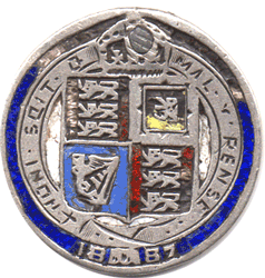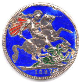 An 1887 enamelled reverse Crown in 3 colours. Reverse: Outer rim area in Royal blue St. George's Cape: in Red Dragon: in Green Obverse: Pin mount at 3 & 9 o'clock. Portrait and legend slightly out of focus as the scanner can only focus on the nearest object - the pin ! Price:...................SEE (GB Crowns 2)