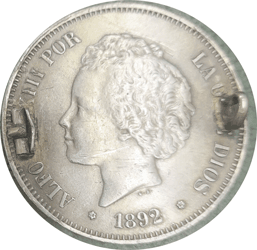 1892 Spanish 5 Pesetas reverse enamelled in 10 or plus colours Used to be a brooch and the pin has been removed Excellent colour workmanship Price:...................£75.00