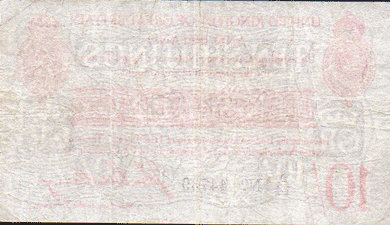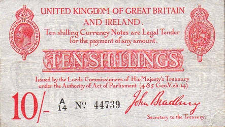 1915 Bradbury - 10 Shillings. (De La Rue printing) Ref: T12/1 - 2nd issue - 1st type. Series starter A/14 No. 44739 Obv. Fairly clean & flat with underlying light creases Rev. Slightly dirtier with far more visible traces of creases. The notes looks better when viewed in the hand than picture suggests but has probably been pressed at some stage Grade: EF?/VF