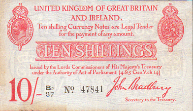 1915 Bradbury - 10 Shillings. (De La Rue printing) Ref: T12/3 - 2nd issue - 3rd type. Mid series B2/37 No. 47841 Obv. Clean & flat with light paper tone a left and bottom left edges. Rev. Clean & flat. Hint of a vertical & horizontal crease (+) The note look better than the pictures show. The note is slightly more creamy in colour and the paper toning is less obvious ! Grade: EF+
