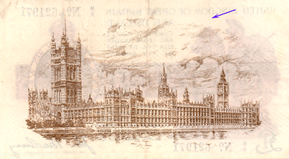1917 Bradbury One Pound - T16 - 3rd issue D/9 No. 621971 Obv. Clean. Small 8 mm tear - top left edge - through the D of KINGDOM The tear is virtually impossible to see unless one bend the note very slightly ! The bottom left corner 1 mm is missing giving a slightly rounded look. Rev. Reasonably clean. Centre crease. Possible an ex-horizontal one also. Otherwise a reasonable example if it were not for the 8 mm tear and tiny pulled corner. Probably pressed at some stage. Grade: EF/EF?