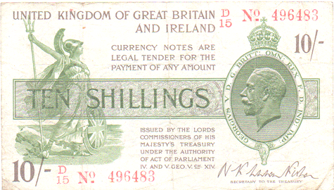 1919 Fisher - 10 Shillings. Ref: T26 - 1st issue - 2nd type (No.) Red numbers. dash below o of No▬ (Red dash) D/15 No▬ 49683 Grade: Obv. Cleanish. Central crease 12 to 6 o'clock. Pin holes. VF Rev. Folded at some stage in 8 squares. Dirt lines in creases and on the bottom half of the note the 2nd 'square' from the left is dirty !