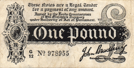 1914 Bradbury One Pound - T3 - 1st issue - 3rd Series - Type 3 - 6 digits G/12 No. 978955 Obv. Reasonably clean & flat. Several pin holes. Deep black colour. Rev. Similar condition to the front. Signature of OY Cooke &dons !? (upside down above ONE POUND) Pager slightly toned. Probably pressed at some stage. Grade: VF