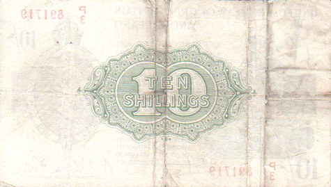 1922 Fisher - 10 Shillings. Ref: T30 - 2nd issue - Red numbers. No (Omitted) P/3 891719 (Mid series) Grade: Obv. Slightly dirty - flat. Traces of creases. Appearance VF or VF+ Rev. Dirty at right half. Creased in 3 from top to bottom. 1 crease from side to side, Ex folded into a small square of 8. POOR !
