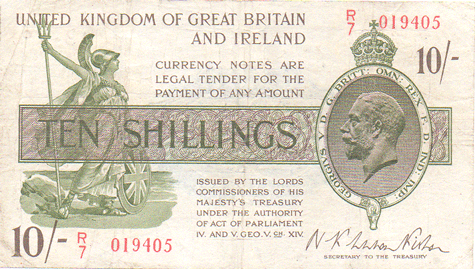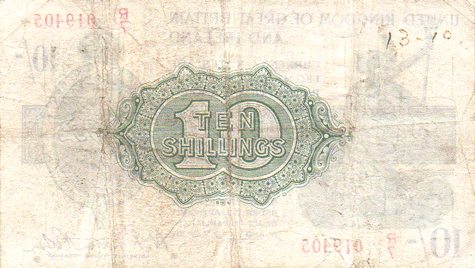 1922 Fisher - 10 Shillings. Ref: T30 - 2nd issue - Red numbers. No (Omitted) R/7 019405 (Mid series) Grade: Obv. Cleanish - flat. Traces of creases. Appearance VF+ Rev. Creased in 3 from top to bottom. 1 crease from side to side, Ex folded into a small square of 8. Number 13 - 10 at top right. Fine