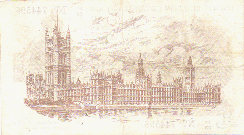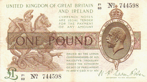 1923 Fisher - 1 Pound. Ref: T31 - 2nd issue - 1st type (No.) Black numbers. Dot below o of No● F1/83 N0. 744598 Mid series Grade: Obv. Cleanish but paper slightly toned. Trace of vertical centre crease with slightly dirt mark from bottom up to ONE POUND mark. Pin holes - bottom left below ONE VF+ Rev. Lightly toned paper. Trace of several creases. Having been folded in eight. VF