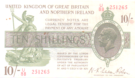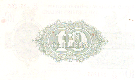 1927 Fisher - 10 Shillings. Ref: T33 - 3rd issue - Red numbers. No (Omitted) NORTHERN added U/88 251265 (Mid series) Grade: Obv. Clean, choice, crisp. A couple of pin-head rust spots to the left of the trident. One pin-head rust spot above H and S of SHILLING. Rust spot just below the /- of 10/-. Otherwise AUNC Rev. Clean, choice, crisp. The rust spots are the mirror image of the spots as can be seen on the obverse. Otherwise AUNC