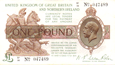 1927 Fisher - 1 Pound. Ref: T34 - 3rd issue - With "NORTHERN" IRELAND added - Black numbers. Dot below o of No● S1/14 N0. 047489 Series starter Grade: Obv. Clean. Trace of crease at top left and bottom right corners. EF+ Rev. Clean Trace of crease - as front. Also faint trace of crease at 1/3 & 2/3 vertically. EF+