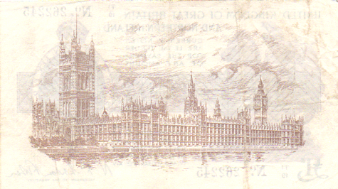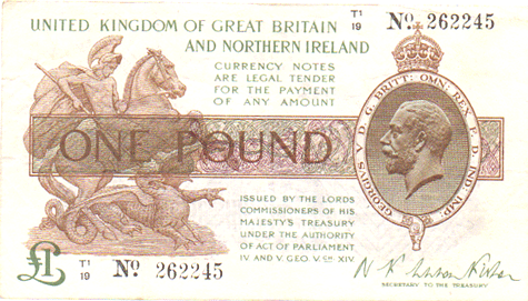 1927 Fisher - 1 Pound. Ref: T34 - 3rd issue - With "NORTHERN" IRELAND added - Black numbers. Dot below o of No● T1/19 N0. 262245 Mid series Grade: Obv. Clean. Some vertical creases when held to the light. EF Rev. Slightly dirty. Several vertical crease marks. VF