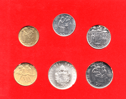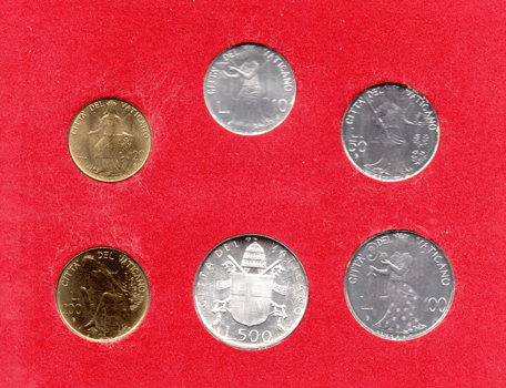 VATICAN CITY - Uncirculated set 10 Lire to Silver 500 Lire (6 coins) in original folder Issued for Pope John Paul II (2nd year or reign) The 500 Lire weighs: 11.00 Gram. Purity of silver 0.0835 (0.2953 ASW) Diameter: 28.5 mm. The coins are in choice unused condition.