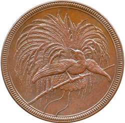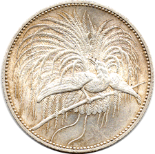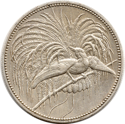 An 1894 German New Guinea 1 Mark. The coin is in Bright EF to EF+ except that at the top edge - Obv. 11 o'clock to 12 o'clock the edge has been pinched. Rev. 12 o'clock to 1 o'clock the same but to a slightly lesser extent. Difficult to know if it is a flaw to the blank or the coin has been pinched in that area. Otherwise still a very nice coin. Our Price........................SOLD