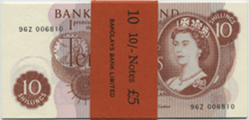 B309 - block or run of 10 x 10 Shilling notes with original wrapper