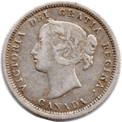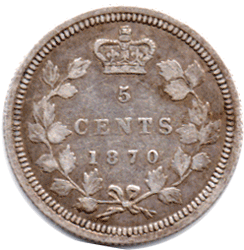 1870 Canada - 5 Cents - Wide flat rim. Rev. Has long border teeth. VF