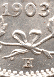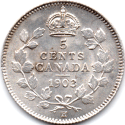 1903 Canada - 5 Cents - H below wreath [Large* H] Bright - EF *As I cannot find a comparison picture of the 1903 large & small H I have had to be guided by the pictures shown of the 1902 large & small H and this is as per the picture of the large H for 1902.