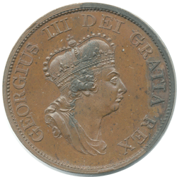 Restrike pattern – Type R78. Peck 1258 – Bronzed [R] Obv. 1. Draped bust wearing a large crown. 2. K . on the lowest fold of the shoulder drapery. 3. Only half a pearl above cross on front of crown. Rev. 1. Britannia seated on rock, with shield, trident & olive branch. 2. Middle prong of trident points to 1st limb of N 3. . . on raised to right of rock, SOHO below shield. 4. Thin raised line around shield, except to left & right of SOHO. 5. 4 short horizontal lines between trident and shield. 6. New ship with poop deck but NO gunports. 7. Under the stern is an irregular raised lump. 8. A flaw runs from curved edge of sea, across Britannia’s foot, down to rocks. 9. A flaw runs either side of the second 9 of 1799.