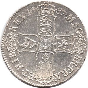 1687 Crown - James II - Edge: TERTIO Obv. Very slight haymarking on top part of hair and on wreath. Rev. Small ex-carbon spot to the left of G of MAG. The French shield at 6 o'clock has light haymarking. At 9 - 10 o'clock there is a slight flaw in the metal at the edge of the coin (slight bit of metal missing) !? Grade: Bright EF or better ? Otherwise a really nice coin with virtually no wear.