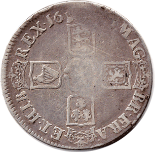 1695 or 96 Crown Edge: OCTAVO Obv. 1st bust Rev. (Shield 1 & Harp 1). The leg of an R is struck below the T of ET. (Unlisted variety).. Date: Extremely weakly struck at right side of date that in fact the 95 or 96 of the date is not visible. Due to the obv. with 1st bust and shield & Harp 1 it has to be either 95 or 96. A difficult coin to date and therefore to grade - if a date were clear than the coin would be FAIR !