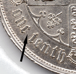 1853 Rev. A - The normal reverse of the florin from 1852 to 1887 (Gothic type) - Reads ONE FLORIN - ONE TENTH OF A POUND. 1853 Rev. B - ERROR reverse has the E or 'e' of one as a 'c' or unfinished 'e' instead ! Reads ONE FLORIN - ONC TENTH OF A POUND This variety is unlisted in any reference books. Several collectors have known of its existence for some time. This reverse error is not just a ONE off (or even a ONC off !) We have noted that this error reverse die has been used starting in "possibly" 1852 and then used in most years up to and including 1860. A colleague believes that he has seen ONE example of the very first date 1852 with this variety but that was only as a picture of a coin sold on Ebay in 2004. He was unable to purchase the coin and so far another example has alluded him. So if anyone has an example of an 1852 with a ONC reverse I would be interested to hear about or possibly even buy it if it were for sale. The other date that is proving elusive is 1859 with the error "onc" and again I would be pleased to see or hear of an example. This error reverse die "ONC"seems to have had a very long life and makes for an interesting search to now find examples. The 1853 seems to be the easiest dates to find at present but it would be interesting to make a list of these errors known so a more accurate list of known coins can be compiled.