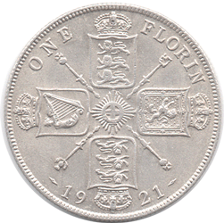 1921 Florin A Rev. The lower 2 of the top 3 lions are slightly weakly struck (as per normal) from the slightly later use of the die. Grade: EF+ Bright