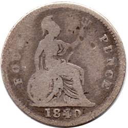 GR 1840 B - Obv. Much of legend is worn away Rev. Centre stem of the first E of PENCE broken off. Reads PCNCE. The NCE has been repaired and double struck but the first E - forgotten ! Unusual variety and RARE Date: Is type is not quite a flat top nor is it a pointed top ! Tthe back of the top is very slightly raised. The 0 is oval. Grade: Obv. Poor - Much of the egend worn away. Rev. Fair? - R of FOU(R) unclear. PCNCE clear. The first E of PENCE clearly shows that the centre bar is missing.