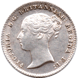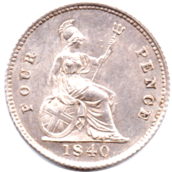 GR 1840 Ac - Obv. - Extra colon dots after F: D: Rev. Type A - A slight trace of Victoria's ghosted head to the right of Britannia's legs Forehead, nose, mouth, lips and chin just visible. The N of PENCE is double struck. There is an extra foot under the left foot. Date: Tall pointed top to 4. Oval '0'. The '0' is just below the base line Grade: Bright EF+