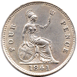 GR 1841 Ab - Rev. Die crack from edge 10 o'clock, splits in two. one part goes to the top left edge of the R. The other crack turns left and travels down to the top of the U of FOUR, along the top, and into the right side of the O at 2 o'clock. Date: Type b - Slightly taller pointed top 4 sticks up higher than the other numerals - with a T- type tail. Both numerals 41 have been double struck. The 41 are just below the baseline. There is a die crack from the border tooth just below the first 1 of the date, running up to the top centre of the 1, into the exergue line and onto the base of the shield at 5 o'clock. The last 1 is over a gap between two border teeth. Grade: Bright EF?/EF