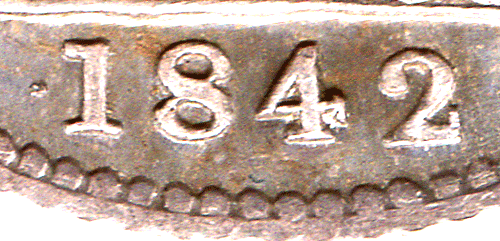 GR 1842 C - Obv. Choice greyish tone. Rev. A 1mm die crack at 1 o'clock from edge to left hand tip of Britannia's trident. Date: There is what appears to be a full stop just before the 1 of the date. * I believe that this is just a bit of grit that got stuck to the reverse die. Pointed top 4 - with a T bar tail. Grade: Choice greyish tone pAS