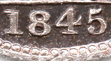 1845 Date varieties All of the 1845 groats appear to have the 18 of the date in a fixed position. The position of the 45 can vary slightly as can the size of the font. * Previously from 1840 to 1844 all of the 4's (bar 1 ?) had a T-bar tail.