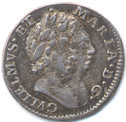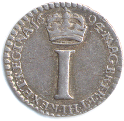 1694 Maundy penny - Obv. GVL below bust. Rev. HI instead of HIB
