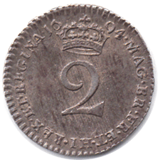 1694 Maundy 2d - Obv. GVL below bust. Reads MARLA for MARIA Stop after D. G. The MARLA variety is considered VERY rare & is the rarest 2d variety. Rev. .HI. for HIB The "E"s in both REX & REGINA have lost their top bars A very poor attempt to repair has been made as double bit of 2nd E shows below the original E but still NO top bar !