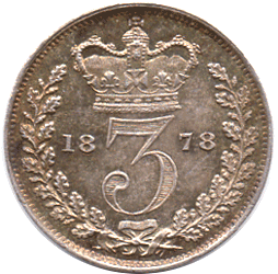 1878 Maundy or Currency 3d * ? - Choice deep toned pAS * Trying to tell the difference between a Maundy or currency 3d is virtually impossible when the 3ds is NOT in a matched Maundy set as the die after being used to make Maundy coins was then used to make the currency coins. A 'first' strike currency coin can be as 'prooflike' as any Maundy coin and some Maundy coins are not always that 'prooflike' anyhow ! Maundy 3ds oddments are much scarcer than currency 3ds due to the lower mintage and that most Maundy 3ds will already be with the Maundy set. The 3d is the 'key' coin to the Maundy sets as many were removed as collectors tried to find choice currency coins for their 3d collection. 1878 Maundy mintage figures: 4d - 5,735. 3d - 4,488. 2d - 6,709 & 1d - 9,903 So this 3d could be either Maundy or currency - whichever both are scarce in this grade.