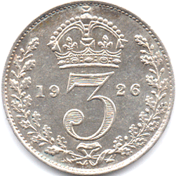 1926 Maundy 3d - 3 + B Obv. 1st issue head type Grade: Choice proof Bright The mintage of 1,504 for the 3d is the smallest mintage for all of the other denominations. This obverse, for this date, is extremely difficult to find in choice grade for the currency issue and has been seen offered for sale up to £150.00.