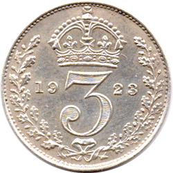 1923 Maundy 3d - Obv. 3 - Rev. B This date of 3d is only available as a Maundy coin as NO currency coins were issued for this date. The mintage of 1,430 for the 3d is the smallest mintage for all of the other denominations. Much rarer than the 1927 Proof 3d ! Mintage: 15,000